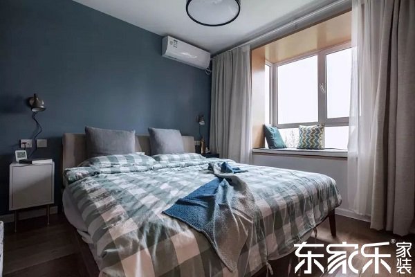 主臥的床頭背景墻為深藍(lán)色,搭配淺灰色床靠,讓睡眠環(huán)境更加靜謐。