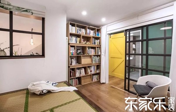 次臥采用榻榻米床的設(shè)計(jì),床尾設(shè)置了整面的書柜,節(jié)省空間,增加收納面積