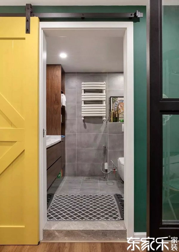 衛(wèi)生間采用的是谷倉(cāng)門,讓空間更寬敞,明亮的黃色與墨綠色的搭配,讓家更顯精致格調(diào)。