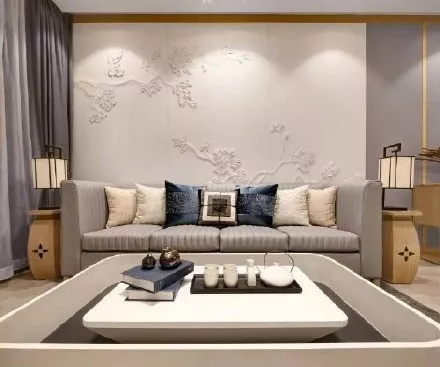 梅花浮雕沙發(fā)背景墻簡直不要太美,清逸俊雅的梅花表現(xiàn)屋主人高潔的人品。灰色布藝沙發(fā)沉穩(wěn)淡雅,擴寬視覺空間。新中式風(fēng)格講究邊幾對稱,兩盞對稱的中式臺燈極具韻味,在客廳起到畫龍點睛的作用。富有層次感的灰白茶幾造型獨特,古色古香的茶具和書籍,讓生活更有格調(diào)。