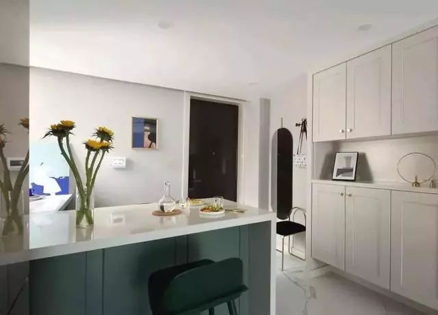 入戶右側(cè)是一個L型大吧臺,折角部分不僅是廚房的延伸部分,平時也可以當做開放式工作間。