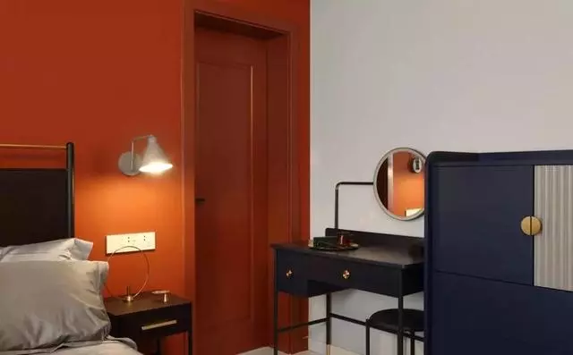 主臥在床和床頭柜的選擇上以沉穩(wěn)的黑色為主,墻面右側(cè)有一扇通向儲物間的門,考慮到視覺色塊的統(tǒng)一性,將門框和門板全部涂刷為同款橙色。