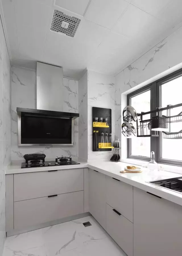 廚房空間采用明亮的色調(diào),從視覺上放大空間,看上去不會過于狹小。合理利用墻面進行收納,小空間倒也干凈整潔。