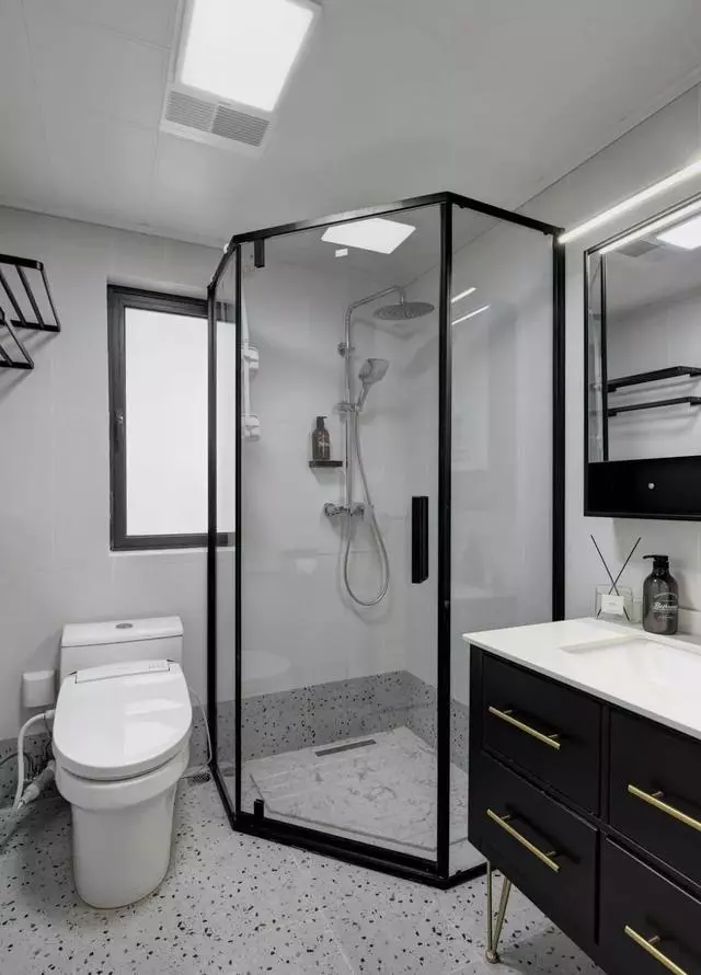 衛(wèi)生間雖小,也做了干濕分區(qū),衛(wèi)浴柜的金色拉手和細腳的設(shè)計,給人以視覺上的驚喜。