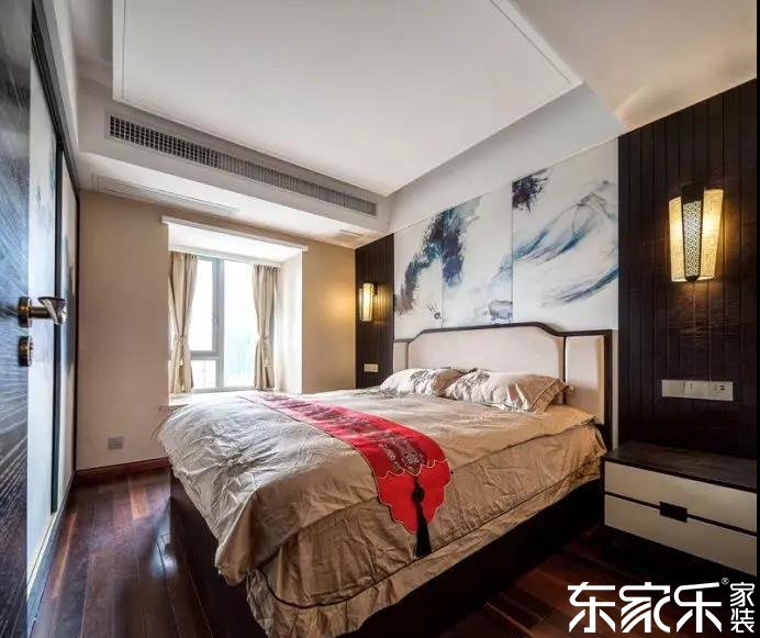 床頭兩邊的兩個對稱的壁燈在深色的墻壁映襯下更加有古風的氣氛,而在床頭上方的墻壁上用的是有點中國古畫的三塊大瓷磚,而簡單地窗戶有緩解了臥室的整個莊重的氣氛。