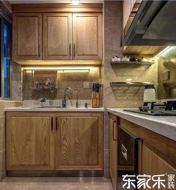廚房的地板,用的是茶色的,美觀耐臟,修飾著廚房,顯得流暢自然。