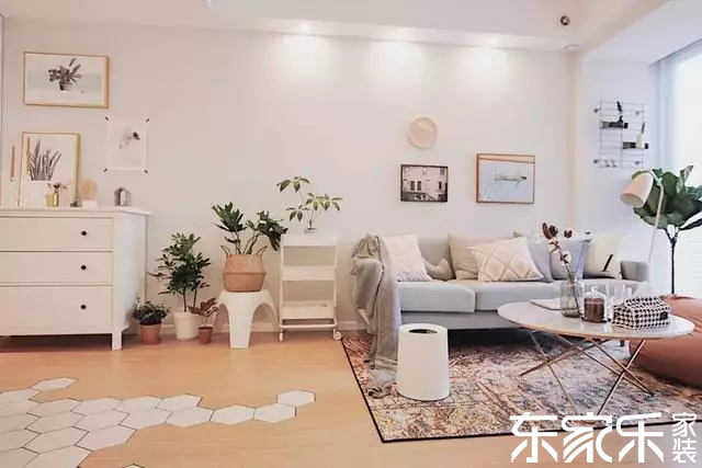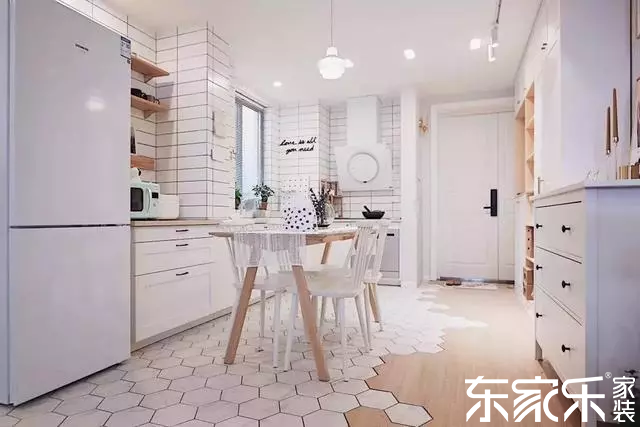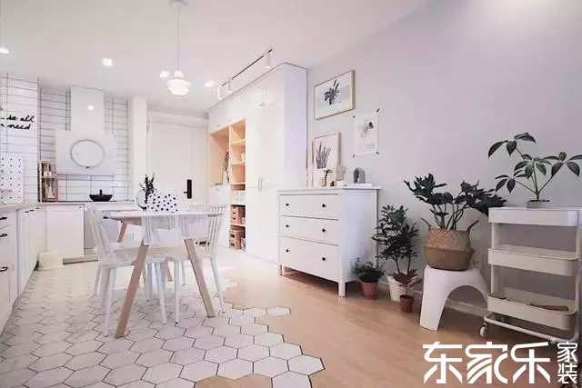 入戶沒有玄關(guān),一側(cè)靠墻設(shè)計(jì)了鞋柜和收納柜,另一側(cè)是開放式的餐廚區(qū)域,實(shí)木地板與六角磚的拼接組合,瞬間提升整個家居的顏值。