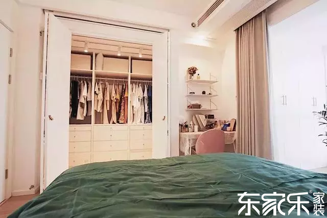 主臥的設(shè)計(jì)非常豐富,床尾利用內(nèi)凹的部分打造成 一個獨(dú)立的衣帽間,右側(cè)靠窗的角落則剛好擺放一個梳妝臺,充分利用空間。