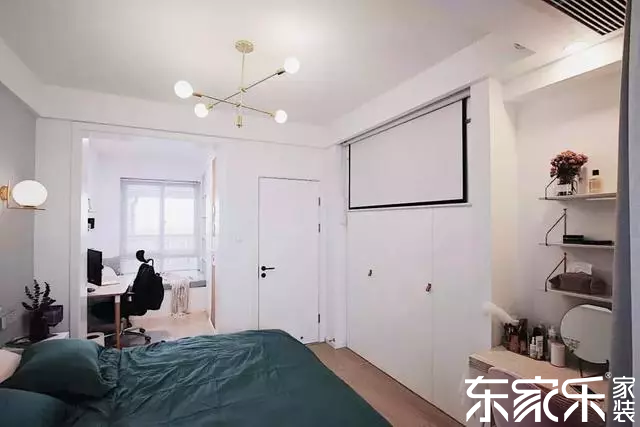 床頭靠窗的區(qū)域,被設(shè)計(jì)成小書房,簡單的擺放一張書桌和椅子,小小的空間作為娛樂辦公來使用,非常實(shí)用,臥室沒有擺放電視的空間,所以裝了一個投影儀,休閑時間可以看看電影也是不錯的選擇。