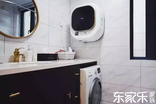 衛(wèi)生間整體是黑白搭配的,洗衣機(jī)放置在洗漱柜中,臺面可以放置不少東西。大理石墻磚加上些許金屬點(diǎn)綴,充滿精致格調(diào)。