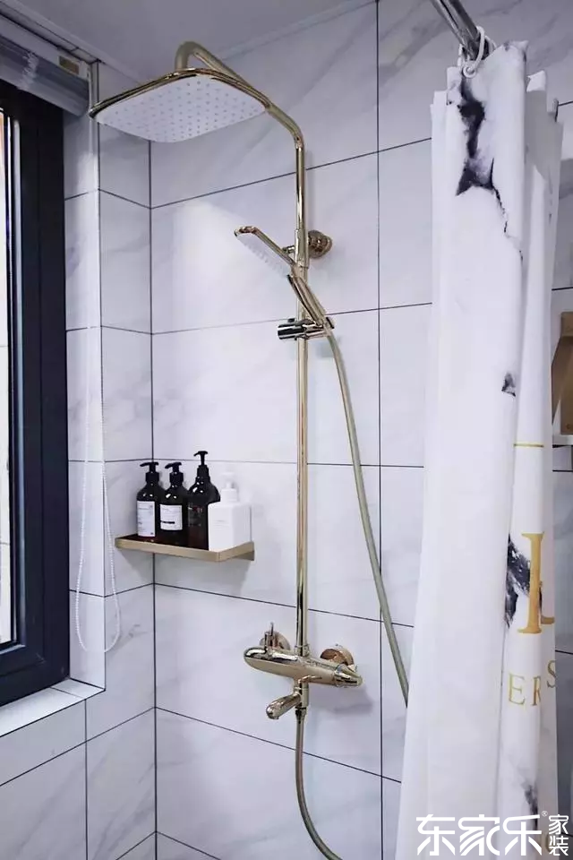 干濕區(qū)用一塊浴簾作為隔斷,實(shí)用又能有效的阻擋水,花灑選的是恒溫的,避免洗澡來回調(diào)節(jié)溫度。