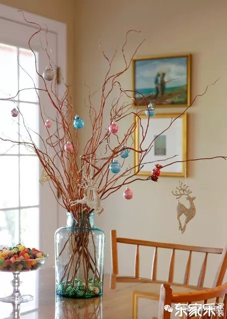 從院子里覓食或從花店撿來的枝條,放在玻璃器皿里,裝飾著裝飾品,可以做出可愛而持久的季節(jié)性展示。如果你的安排看起來頭重腳輕,那就用硬糖部分填滿花瓶,以減輕重量。